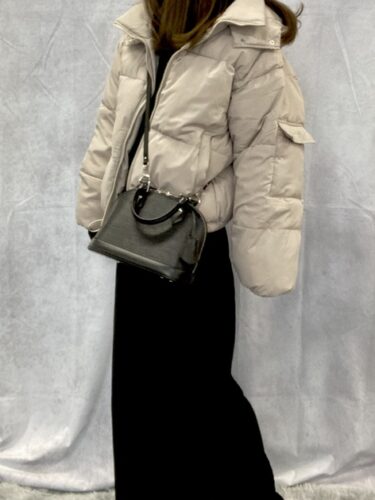 ボリューム感のあるジャケットと黒のロングスカートが作る縦長シルエットに、アルマBBを合わせることで、全体がすっきりとした印象になります。