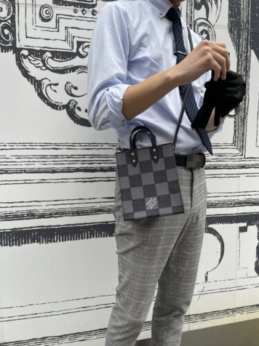 続いて紹介するのは、ルイヴィトンのサックプラを取り入れたスーツスタイルです。ダミエのモダンで洗練された雰囲気が、爽やかでおしゃれなスーツをマッチしています。