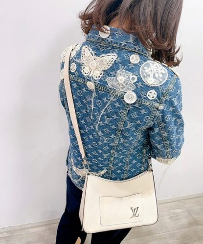 マレルのホワイトカラーと控えめな「LV」ロゴが、ジャケットの大胆なデザインを引き立てつつ、全体のコーディネートをすっきりまとめているのもポイント。ショルダーバッグとして持つことで、動きやすさと実用性も確保しています。